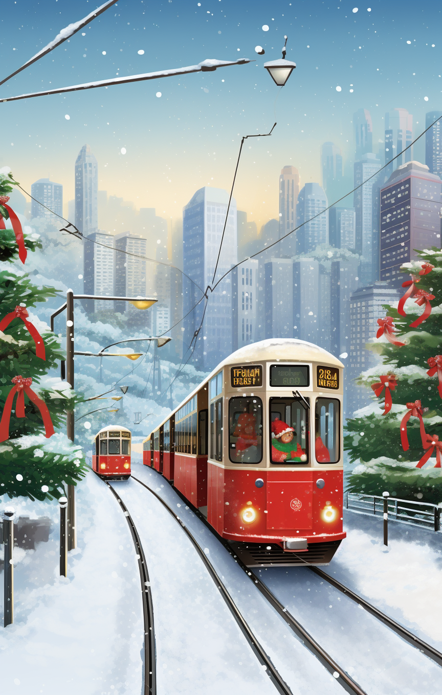 Hong Kong themed fun 12x Xmas cards with snow, Father Christmas and trams in typical scenes.